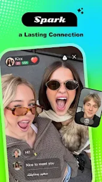 Kizz är en gratis videochattapp designad för att skapa äkta och meningsfulla kontakter med människor från hela världen. Med en färgglad design i neon lime och ljus cyan erbjuder appen en energisk och ungdomlig atmosfär för användare som vill knyta nya vänskapsband. Kizz fokuserar på att eliminera hinder för kommunikation, vilket gör det enkelt att dela historier och skratta tillsammans med nya bekanta. Användare kan enkelt svepa för att hitta samtalspartners och engagera sig i genuina samtal.